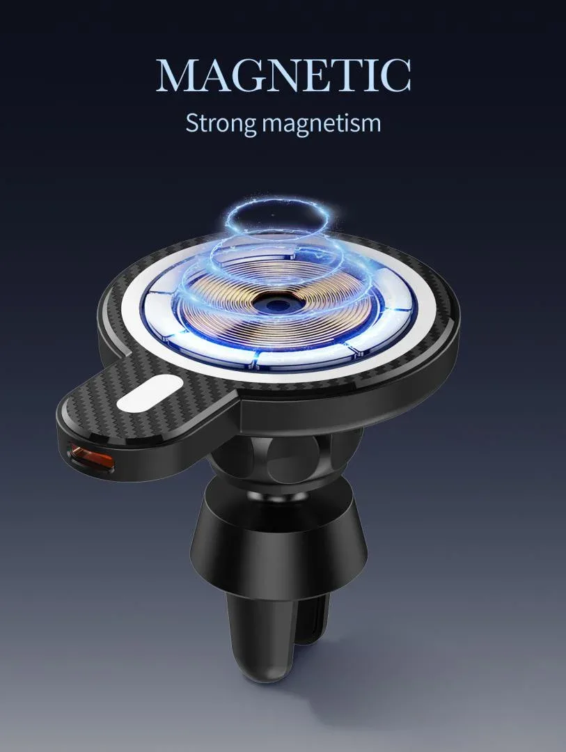 Suport Auto Telefon Serioux, cu incarcare Wireless 15W, compatibil MagSafe, prindere grila ventilatie, Intrare: 5V=2A 9V=2A, Ieșire: 5W 7.5W 10W 15W(Max), Dimensiuni: 61*84*71mm