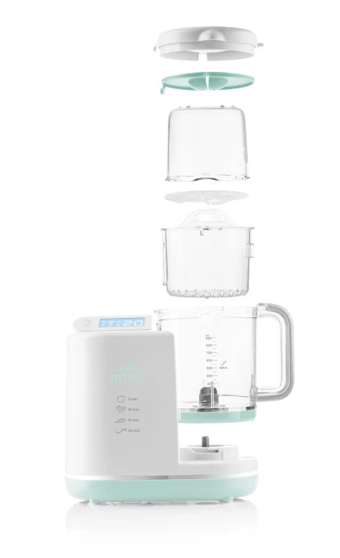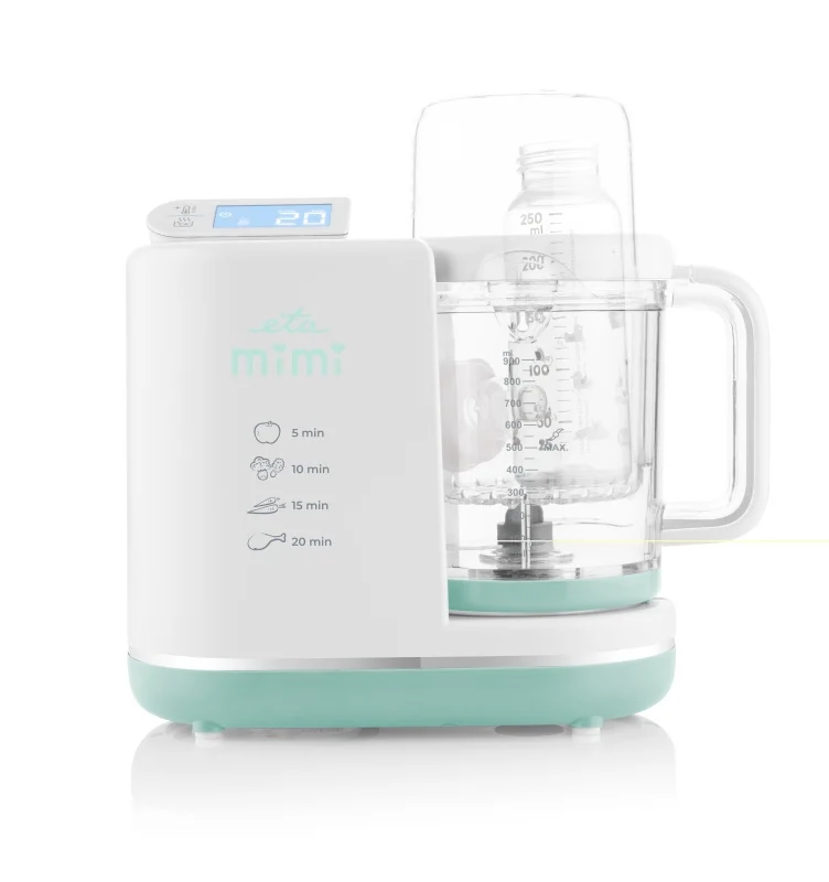 Preparare sanatoasa, usoara si rapida a alimentelor pentru bebelusi Dispozitiv multifunctional 6 in 1 : preparare la abur, amestecare, incalzire, dezghetare, sterilizare, mentinere la cald (1-8 ore la 40°C) Recipiente si accesorii fabricate din tritan sigur pentru sanatate, care nu contine BPA Functie de detartrare (memento automat) 2 trepte de viteza la amestecare Panou tactil cu afisaj LCD rabatabil Cronometru cu optiunea de a seta functionarea de la 1 la 30 de minute si de mentinere la cald de la 1 la 8 ore Protectie impotriva supraincalzirii si in caz de lipsa a apei (oprire automata) Functie de oprire automata (dupa 10 minute) Volumul rezervorului de apa 280 ml Motor DC de inalta calitate pentru durata lunga de viata si functionare silentioasa Recipient de preparare de inalta calitate (0,9 l) si accesorii din tritan Elementele separate se pot spala in masina de spalat vase Sistem automat de detartrare care faciliteaza curatarea Putere de incalzire 700 W Motor de 120 W Lungimea cablului de alimentare 0,9 m Accesorii incluse: Recipiente pentru prepararea la abur si pentru sterilizare (2 buc) Aparatoare impotriva stropilor Filtru Pahar de 0,3 l Racleta pentru amestecare Penseta din plastic Proiectat pentru gatirea sanatoasa si rapida a alimentelor pentru copii Fiecare mama stie ca pregatirea alimentelor proaspete si sanatoase pentru copil poate fi o provocare. Cu acest aparat multifunctional ETA Mimi 6 in 1 primesti un ajutor nepretuit, economisesti timp si energie si poti astfel petrece mai multe momente cu copilul tau. In plus, vei avea mai putine griji cu privire la prepararea mancarii. O solutie completa Acest minunat aparat multifunctional ETA Mimi face tot ce ai nevoie: prepara la aburi , amesteca , incalzeste , dezgheta , sterilizeaza si mentine alimentele calde pana la 8 ore. Gatirea sanatoasa la aburi si amestecarea blanda vor crea un amestec ideal pentru primele alimente ale copilului, in timp ce functia de sterilizare va ofera un proces de preparare igienic. Panou tactil si comenzi simple pentru o utilizare convenabila Controlul este simplu si intuitiv datorita panoului tactil clar cu afisaj LCD rabatabil. Puteti seta cronometrul de la 1 la 30 de minute de functionare sau puteti utiliza functia de mentinere la cald prin care mentineti alimentele la 40 °C timp de pana la 8 ore . Beneficiati astfel de mancarea calda sau gata preparata exact atunci cand aveti nevoie. Siguranta si fiabilitate ETA Mimi este echipat cu o dubla siguranta: oprire automata dupa 10 minute si protectie impotriva supraincalzirii in caz de lipsa a apei. Recipientele din tritan de inalta calitate precum si accesoriile sale sunt sigure pentru alimentele copiilor si foarte usor de curatat in masina de spalat vase. In plus, acest aparat multifunctional nu ocupa mult spatiu. Cu dimensiunile sale compacte de (29 x 27,5 x 15 cm) il puteti tine cu usurinta pe blatul din bucatarie fara sa va incurce in vreun fel. Mai mult timp cu copilul, mai putin timp in bucatarie Mancarurile sanatoase vor fi gata in cel mai scurt timp ceea ce iti elibereaza mainile pentru cel mai important lucru – timpul cu bebelusul tau. Aparatul de gatit cu aburi 6 in 1 ETA MIMI 4306 90000 va fi un ajutor indispensabil pentru alimentatia sanatoasa a copilului tau si pentru bunastarea familiei tale!