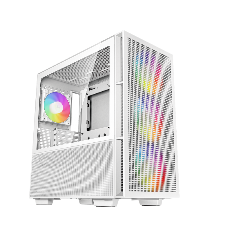 Carcasa DEEPCOOL CH560 Mid Tower ARGB ALB, Tempered Glass, Sloturi Expansiune 7, Drive Bays: 2×3.5″ 2+1×2.5″, Ventilatoare Suportate: 9 (spate: 1x120mm sau 1x140mm, fata: 3x120mm sau 3x140mm, sus: 3x120mm sau 2x140mm, invaluit in sursa: 2x120mm), Ventilatoare Incluse: 4 (spate: 1x120mm, fata: 3x140mm), Format Placa De Baza Suportat: Mini-ITX, Micro-ATX, ATX, E-ATX Lungime Maxima Placa Video: 380mm, Inaltime Maxima Cooler Procesor: 175mm