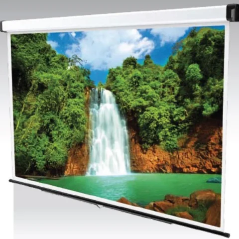 Ecran de proiectie manual, cu prindere in tavan/perete Sopar New Spring, format 4:3, suprafata de proiectie 200×150 cm, diagonala 76 inch, unghi de vizionare 150°, tip panza alba (fata) neagra (spate), din aluminiu
