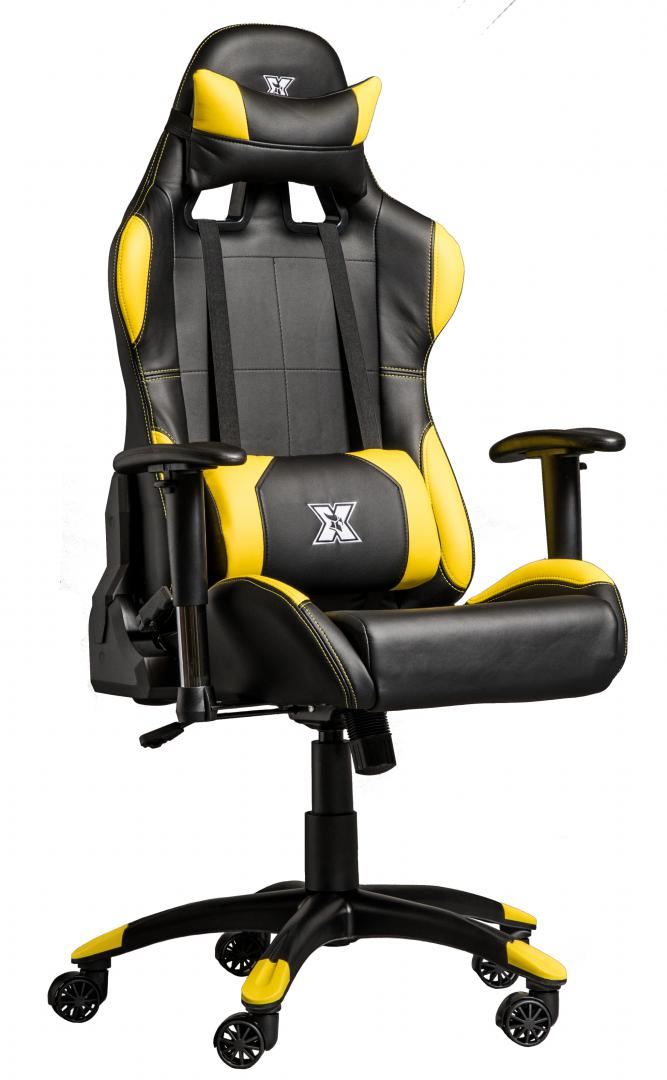 Scaun gaming X by Serioux, Torin, ajustabil, piele sintetica, piston pe gaz, manere reglabile, baza stea cu 5 picioare, greutate maxima admisa 150Kg, perne detasabile, negru si galben