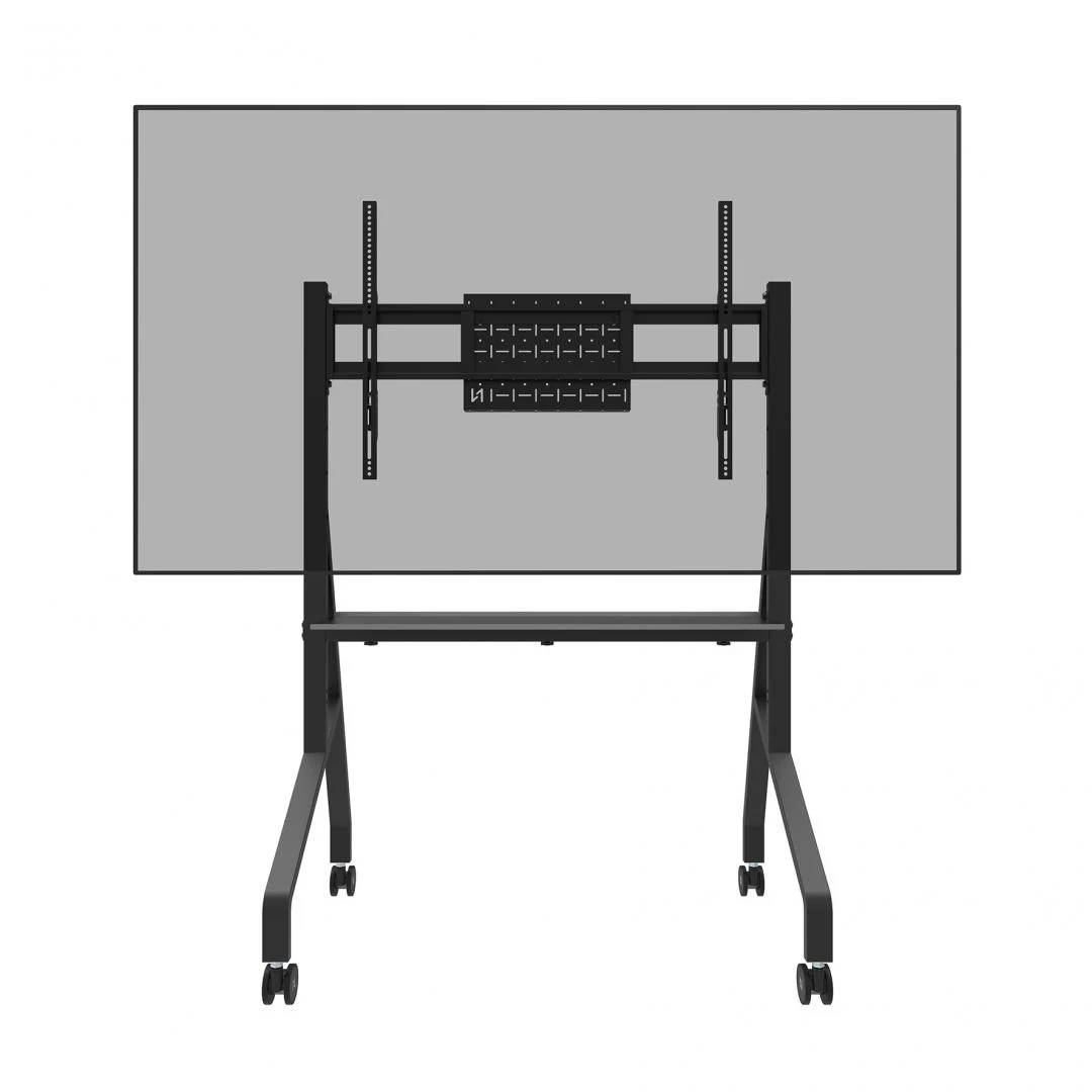 Stand mobil de podea Neomounts by Newstar, 55″-86″, VESA 100×100 ~ 900×600, max load 76kg, fix, inaltime reglabila manual 1060-1360mm (4 presetari), polita AV max load 10kg, rack AV, management cabluri, 2 stalpi; preasamblat, usor de instalat, manere practice, roti 7.5cm cu blocare dubla; bracketii se pot incuia cu lacat (nu este inclus), negru