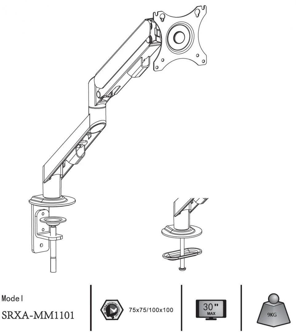 Suport monitor Serioux MM1101, tip: arc cu gaz, reglarea poziției unghiului de înclinare: -45 / + 90 °, pivotant: 180 °, rotatie pentru ambele brate: 360 °, VESA: 75x75mm & 100x100mm, greutate maxima suportata: 9 kg, compatibilitate: 10″-30″