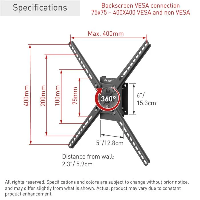 Suport TV perete Barkan, rotatie landscape si portret, dimensiune compatibila ecran 13-65″, greutate maxima suportata 36kg, VESA max 75x75mm-400x400mm, distanta fata de perete 2.3″/ 5.9cm, negru