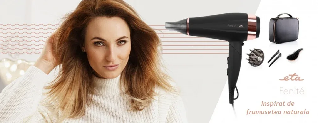 Performanta ridicata de uscare a parului Design practic Consum de energie 2200 W Functie de ionizare COLD AIR SHOT – flux intens de aer rece pentru fixarea coafurii 3 niveluri de temperatura a aerului 2 viteze ale fluxului de aer Indicator luminos de functionare Protectie la supraincalzire Bucla de agatare Maner pliabil pentru o depozitare usoara Operare simpla Geanta de depozitare utila si in calatorii Accesorii si atasamente: o perie de par, 2 agrafe, un concentrator si un difuzor rotativ la 360° Lungimea cablului de alimentare 1,7 m Ingrijirea parului este mult mai usoara atunci cand aveti tot ce trebuie intr-un singur loc. In setul practic ETA Fenite 7320 veti gasi un echipament complet pentru ingrijirea eficienta a parului. Datorita gentii elegante setul este potrivit sub forma de cadou, care garantat multumeste si incanta orice femeie cu parul lung. Ingrijire perfecta pentru parul tau Puternicul uscator de par in design elegant Black Edition de la ETA ofera parului dumneavoastra o ingrijire superioara. Nu numai datorita puterii de 2200 W dar si datorita functiei de ionizare care elimina electricitatea statica din par si il protejeaza de uscare. Daca doresti o coafura dreapta foloseste concentratorul de aer rotativ la 360° . Il puteti inlocui insa cu usurinta cu un difuzor, cu ajutorul caruia veti obtine un volum uimitor. Cu ajutorul butoanelor de pe maner puteti alege intre 3 niveluri de temperatura si 2 viteze ale fluxului de aer. Coafura se poate fixa rapid apasand butonul COLD AIR SHOT uscatorul generand astfel un flux de aer rece. ETA Fenite 7320 este conceput pentru a oferi tot ce este mai bun utilizatorilor sai: forma practica, linii fine si design elegant in negru cu detalii roz aurii, maner ergonomic care se potriveste perfect in orice mana. Cablul de alimentare cu lungimea de 1,7 m asigura o manevrare usoara si in plus bucla de agatare este foarte practica. Echipament complet pentru o coafura perfecta Pachetul include o perie de par care ofera o pieptanare blanda dar eficienta a parului pe toata lungimea acestuia fara a rupe varfurile. Coafarea va fi usurata de clemele practice pentru fixarea suvitelor. Totul este depozitat intr- o geanta eleganta cu fermoar, care poate fi folosita atat in calatorii cat si acasa.